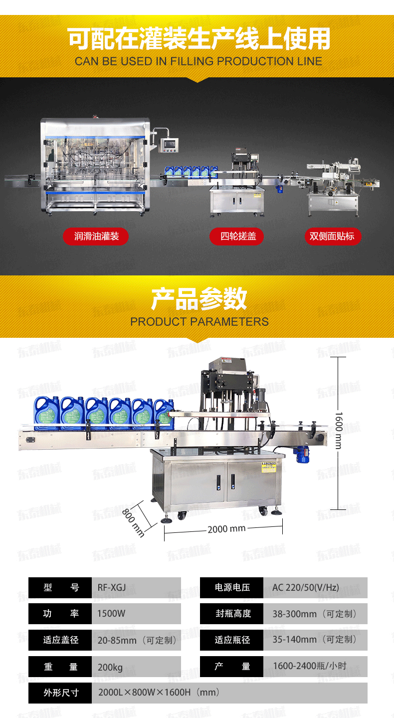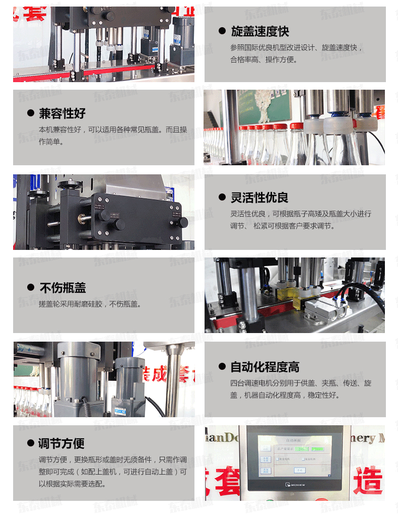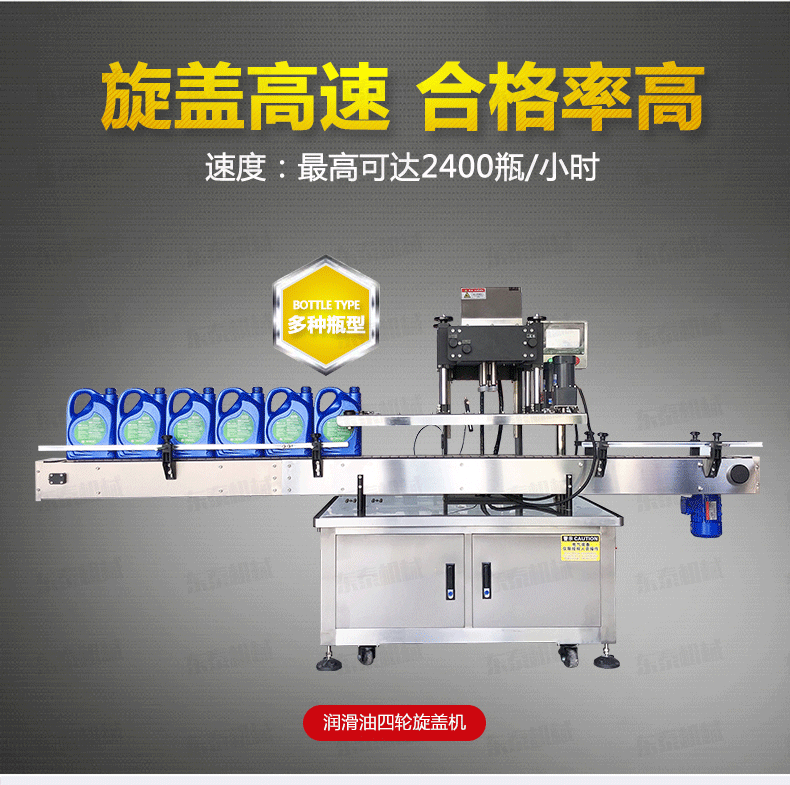 全自動旋蓋機是參照國機型改進設(shè)計、旋蓋速度快,合格率高、操作方便?蛇m用于食品、制藥、日化、農(nóng)藥、化妝品等行業(yè)的不同瓶形的旋蓋。四臺調(diào)速電機分別用于供蓋、夾瓶、傳送、旋蓋,機器自動化程度高,穩(wěn)定性好,調(diào)節(jié)方便,更換瓶形或蓋時無須備件,只需作調(diào)整即可完成(如配上蓋機,可進行自動上蓋)可以根據(jù)實際需要選配。
