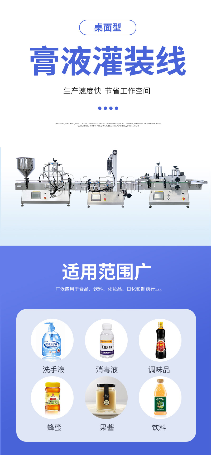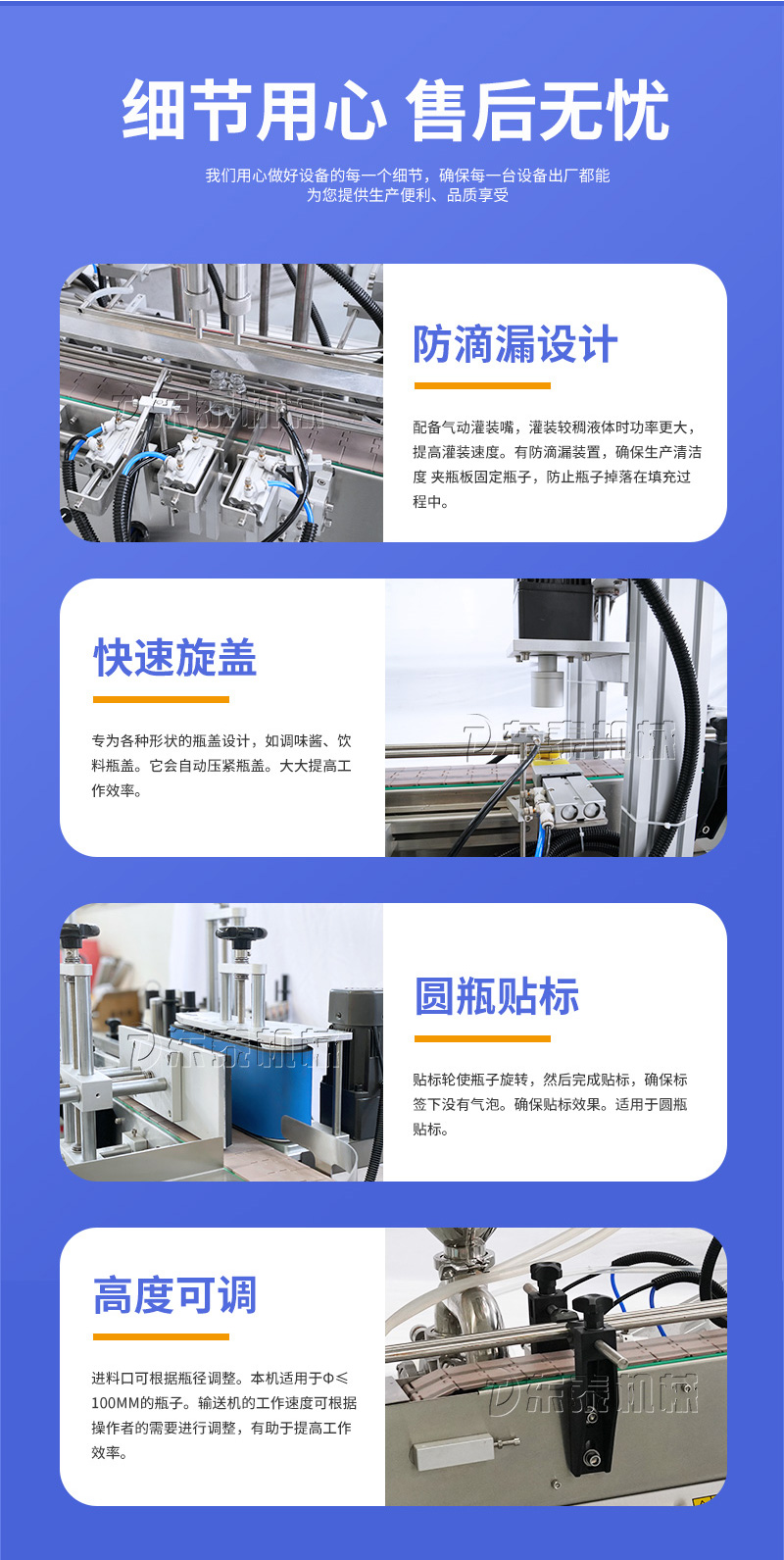 產(chǎn)品說(shuō)明:生產(chǎn)線根據(jù)灌裝范圍選擇型號(hào),灌裝部分為雙頭下潛式灌裝機(jī),適用于不同物料不同瓶子的灌裝,配備自動(dòng)壓蓋機(jī)和圓瓶貼標(biāo)機(jī),可實(shí)現(xiàn)不同蓋子的旋蓋貼標(biāo)工作。