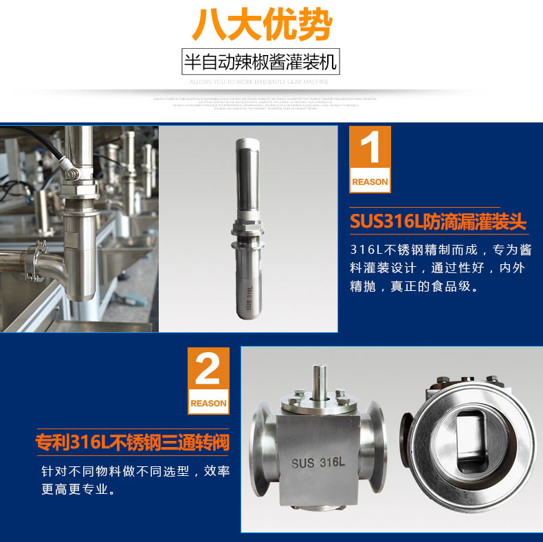 適用范圍:小型辣椒醬灌裝機(jī)主要適用于那些含顆粒的顆粒漿狀流體、半流體、膏體、醬狀類的物料灌裝,各種勻質(zhì)醬料、火鍋底料、老干媽辣椒醬、干煸牛肉醬、泡椒、牛肉粒醬、香菇丁醬、八寶菜、蘿卜丁、含干煸臘肉丁、辣子雞丁、油炸花生等大顆粒、含油量少等干煸辣椒醬的灌裝。