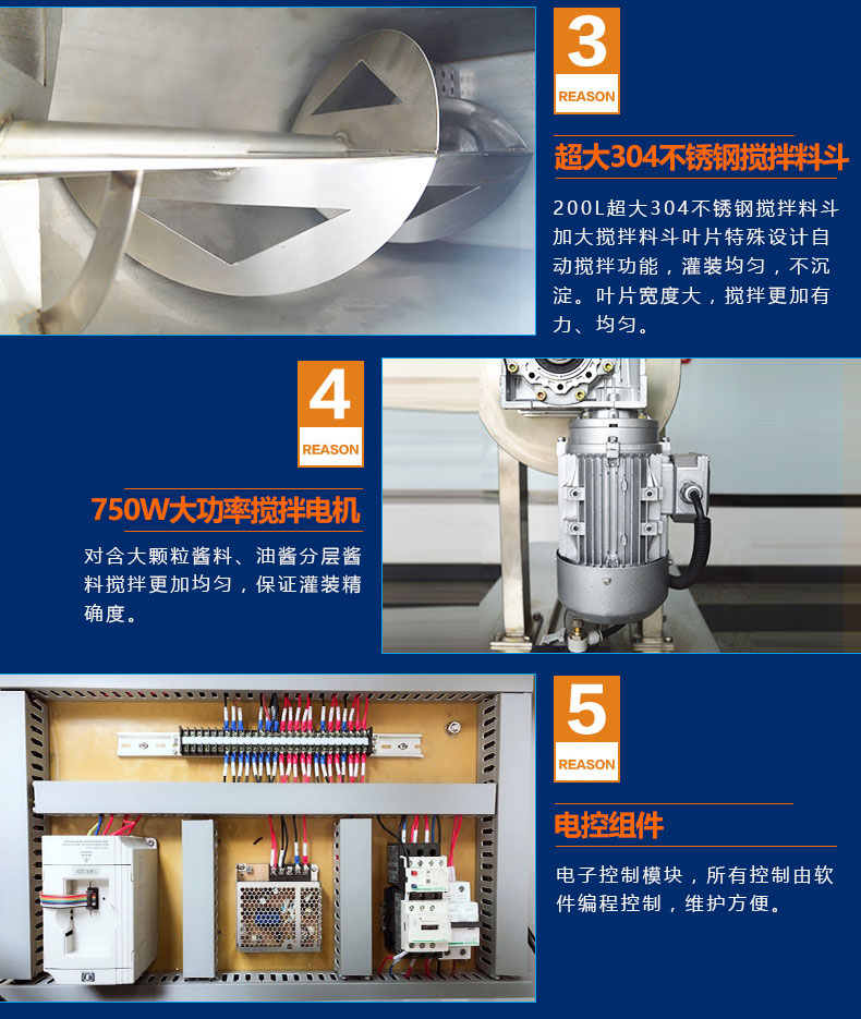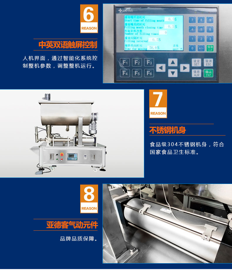 產(chǎn)品簡介:半自動(dòng)醬類醬料灌裝機(jī)SFM系列結(jié)構(gòu)合理、機(jī)型小巧、性能可靠、定量準(zhǔn)確、操作方便。整機(jī)304不銹鋼,灌裝悶頭防漏料防滴油,氣缸驅(qū)動(dòng)結(jié)構(gòu),加大200L料斗,品牌全鋁殼銅芯大功率攪拌電機(jī),變頻調(diào)速,PLC智能控制,用戶可根據(jù)需要任意調(diào)節(jié)灌裝量及灌裝速度,灌裝精度高。