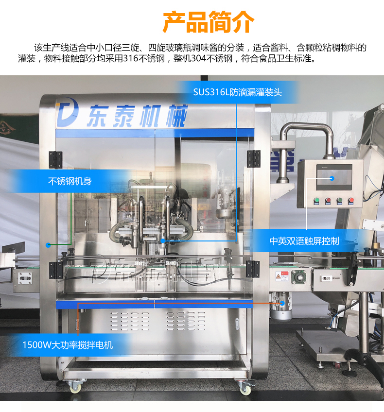 東泰機械通過十多年的努力和發(fā)展,現(xiàn)已成為集科研、設計制造、成套供應、技術咨詢服務、工程總承包為一體的高科技型企業(yè)。如今專業(yè)的東泰技術團隊根據(jù)醬料市場研發(fā)推出的牛肉醬定量灌裝機設備得到市場的認可和用戶的青睞。同時這款自動化、智能化、效率化、功能化的醬料灌裝機械設備帶領著醬料市場進入規(guī);纳a(chǎn)領域中,為相應企業(yè)提供方便、快捷、省時省力的現(xiàn)代化快節(jié)奏的發(fā)展。如果您有需求,歡迎您到東泰機械實地考察選購!